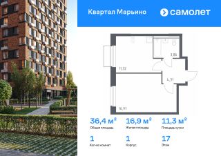 Строим кварталы для жизни с заботой о будущем. Предлагается 1-комнатная квартира комфорт-класса 36,4 кв.м в корпусе 1 на 17 этаже, в ЖК "Квартал Марьино"