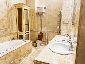 В квартире выполнен авторский ремонт с использованием исключительно натуральных материалов премиум-класса. Комнаты залиты мягким светом шикарных люстр, подчеркивающих изысканную лепнину на потолках. Дизайнерская итальянская каркасная мебель, выполненная на заказ, создает атмосферу утонченного вкуса. Все двери изготовлены из массива ценных пород дерева. Пол украшает изящный наборный паркет из дуба, теплый и приятный на ощупь. Кухня Scavolini оборудована передовой бытовой техникой ILVE, гарантирующей удобство и функциональность. В ванных комнатах установлена элегантная сантехника Sanitan.