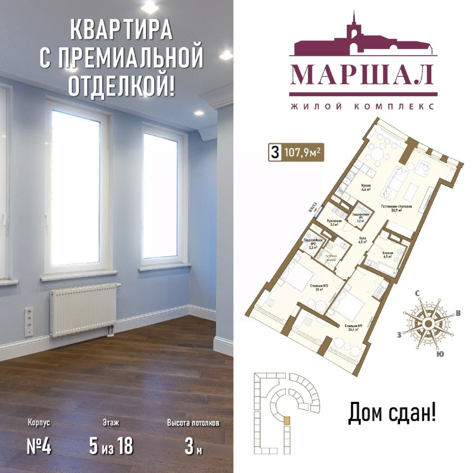 Продаётся 3-комнатная квартира в сданном доме (Маршала Рыбалко, 2К4), срок сдачи: IV-кв. 2011, общей площадью 107.9 кв.м., на 5 этаже. Готовая квартира в элитном МФК "Маршал" с премиальной отделкой "под ключ" (экологичное напольное покрытие - инженерная доска Greenline и керамогранит, высококачественные системы кондиционирования и сантехническое оборудование), выполненной европейскими специалистами по эксклюзивным дизайн-проектам, подчеркнет высокий статус владельца.