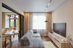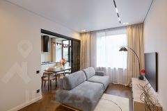 Планировка: кухня-гостиная, спальня с гардеробной, просторный санузел с отдельно стоящей ванной, душем и постирочной зоной, прихожая с дополнительной гардеробной и станцией для робота-пылесоса, открытый балкон (перепланировка в стадии согласования).