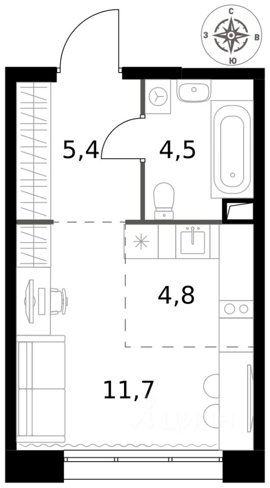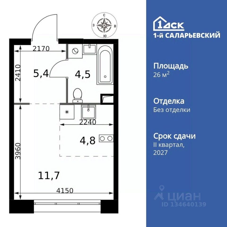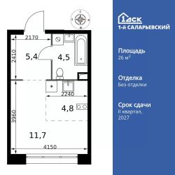 Продаётся квартира-студия номер 595 общей площадью 26.4 кв.м. на 2-м этаже 25 этажного здания. Без отделки. Цена с учётом скидки.