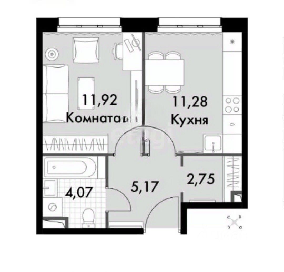 В апартаментах большая кухня площадью 11,28 кв мета, спальня 12 метров и отдельная гардеробная - 2,75 кв метра, а также ванная комната с установленной полноразмерной ванной