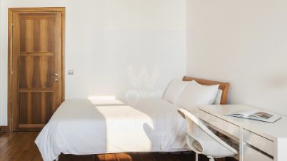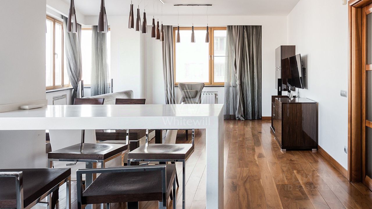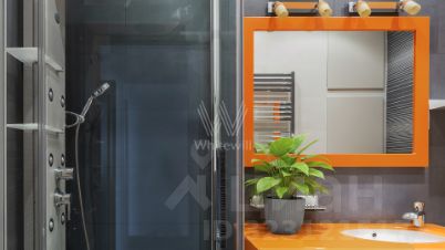 Планировка: угловая кухня-гостиная с обеденной зоной, спальня, две детские спальни, гардеробная, ванная комната с джакузи, санузел с душем, холл. Квартира полностью меблирована и укомплектована премиальной бытовой техникой, установлены кондиционеры и тёплый пол. Из окон открываются виды на город.
