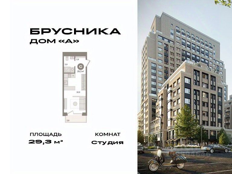 Студия в Доме "А". Особенности планировки: без отделки, вид во двор, балкон.