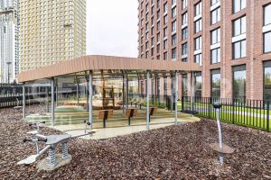 Шикарный подъезд с зоной отдыха, консъерж 24/7. Территория двора закрыта, вход по электронным картам. Во дворе выполнено красивое ландшафтное озеленение, детские площадки, баскетбольное поле, спортивная площадка.