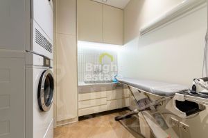 - Ванная с душевой кабиной, гостевой санузел и полноценная постирочная. В прихожей предусмотрены вместительные гардеробные шкафы и стеллажи для хранения.