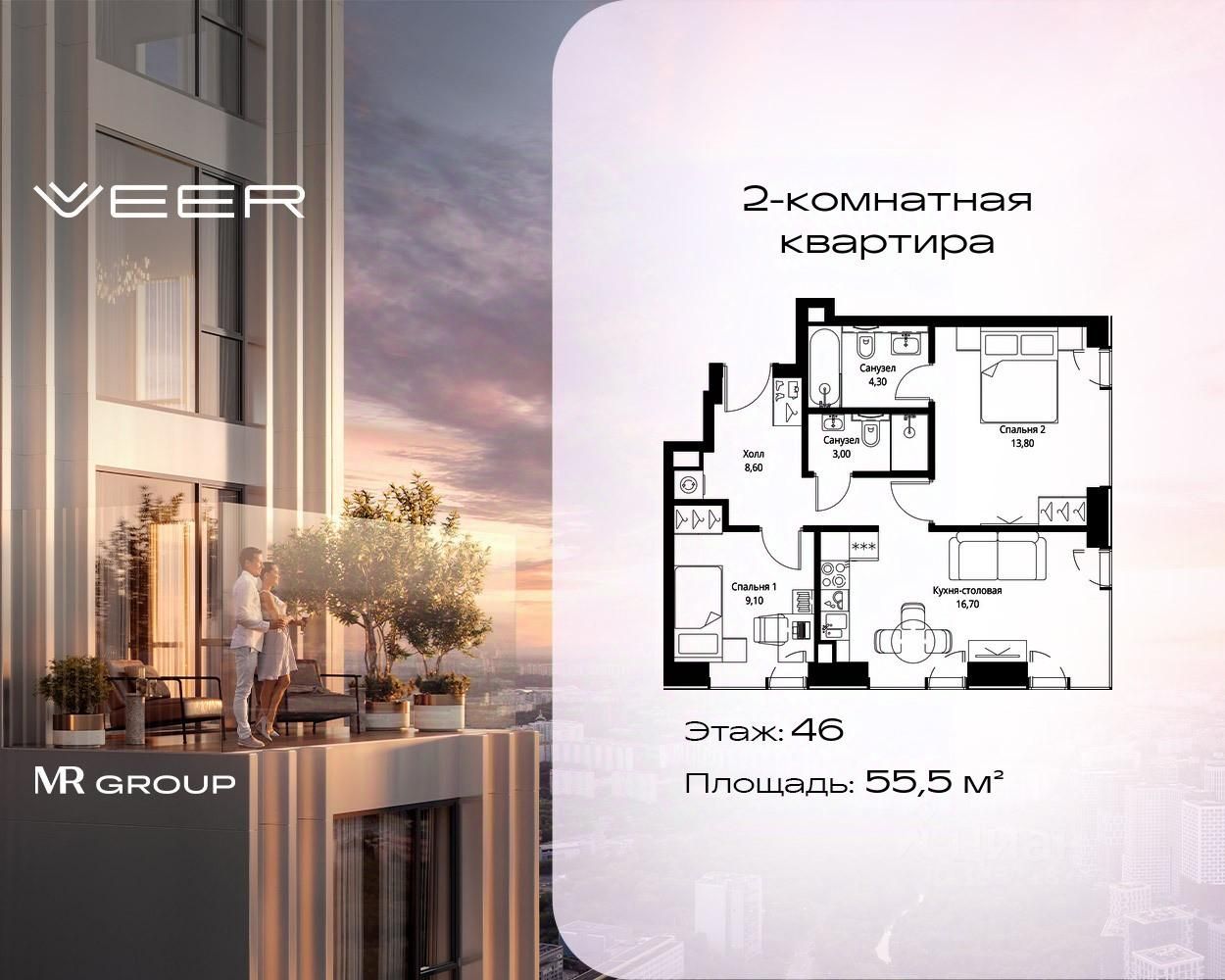 Продаётся 2-комнатная квартира общей площадью 55.50 м² с предчистовой отделкой в ЖК VEER на 46-м этаже 46 этажного дома.