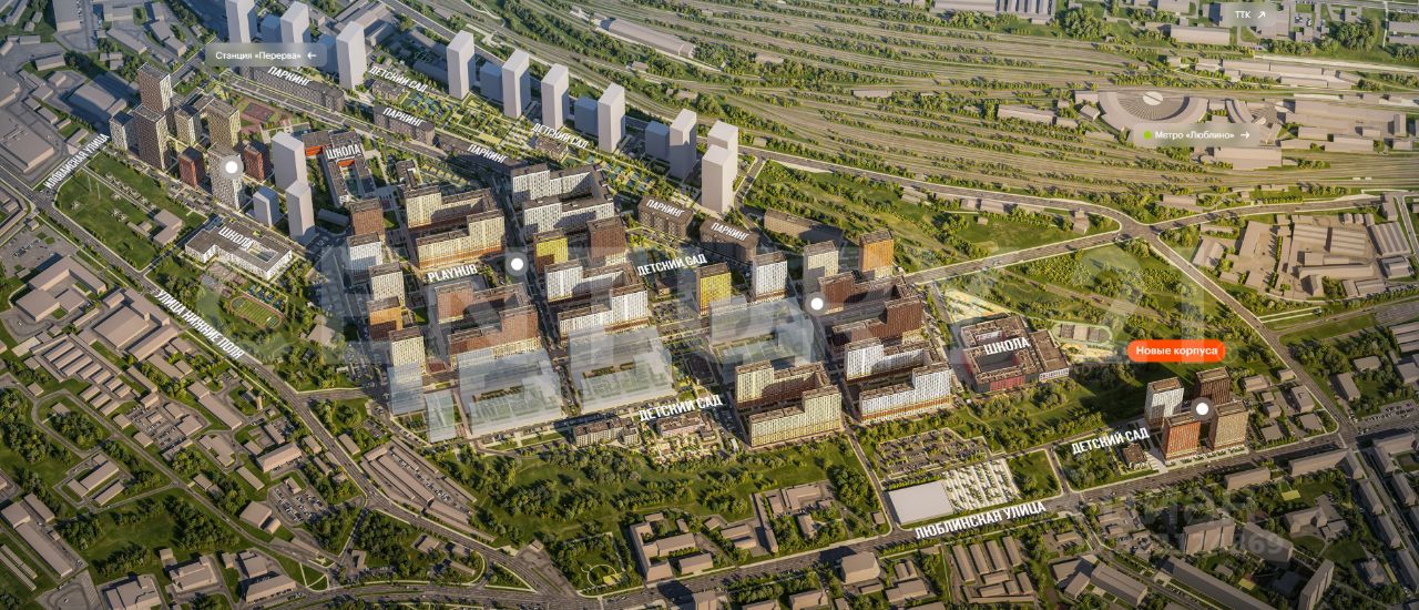 "Люблинский парк" — современный жилой квартал с домами разной этажности, что обеспечивает хорошее естественное освещение и простор во дворах. Между корпусами тянется пешеходный бульвар — отличное место для прогулок и отдыха на свежем воздухе. Для детей оборудована игровая площадка PlayHub, а для любителей спорта — мини-футбольное поле и зона ПИКСПОРТ.