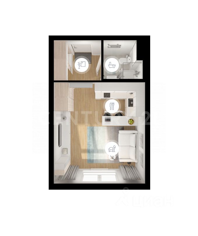 Однокомнатная квартира площадью 23,5 кв.м;