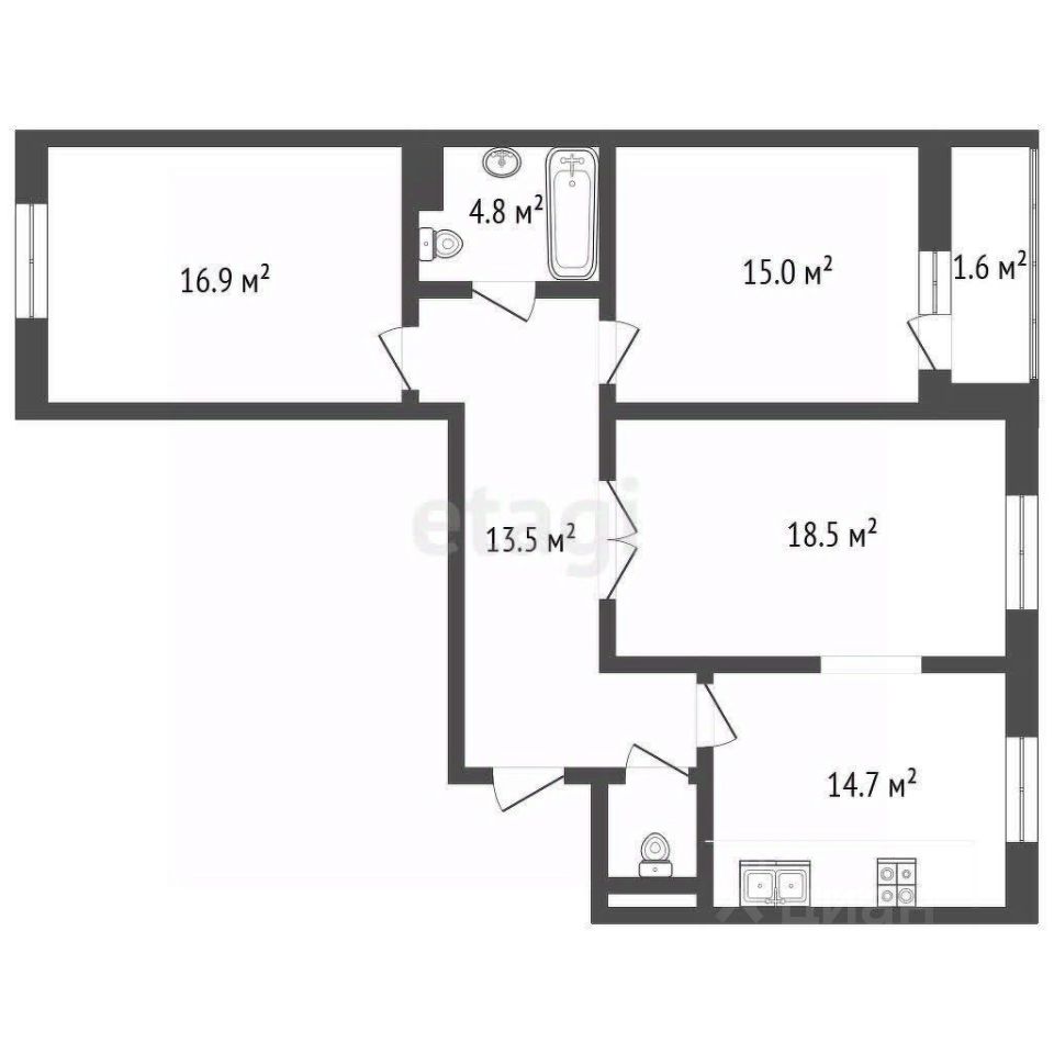Три отдельных просторных комнаты, одна из них с балконом. Окна выходят на обе стороны (распашонка).