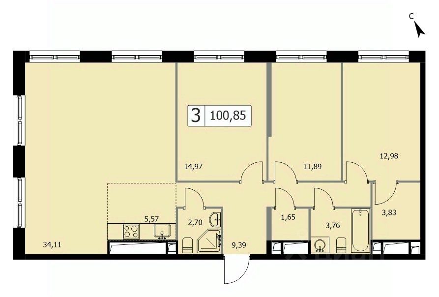Просторная и светлая квартира площадью 100,5 кв. м. Продуманная планировка квартирывключает в себя отдельное расположение спальни от обеденно - гостиной зоны. Из оконгостиной открывается вид на Останкинскую башню, колесо обозрения и другие высотные