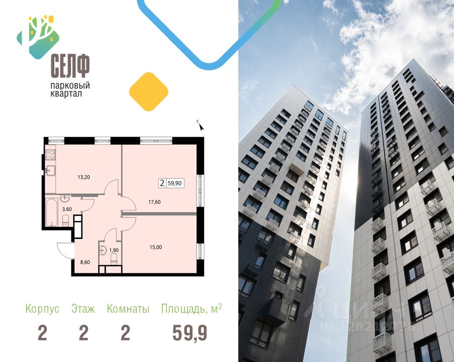 Продается просторная и светлая квартира площадью 59,9 кв. м. на 2 этаже в современном ЖК Парковый Квартал Селф. Дом сдан - ключи в день покупки! Семейная ипотека от 5,99%.