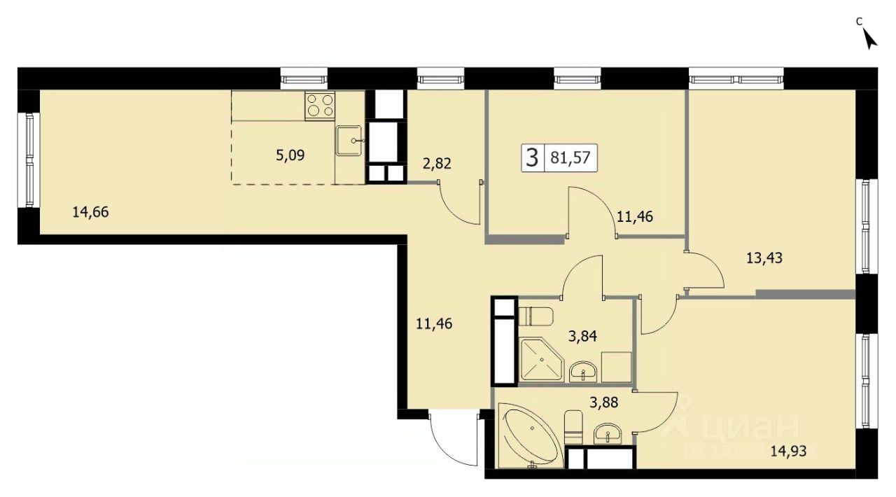 Просторная и светлая квартира площадью 81,8 кв. м. Продуманная планировка квартирывключает в себя отдельное расположение спальни от обеденно - гостиной зоны. Из оконгостиной открывается вид на Останкинскую башню, колесо обозрения и другие высотные