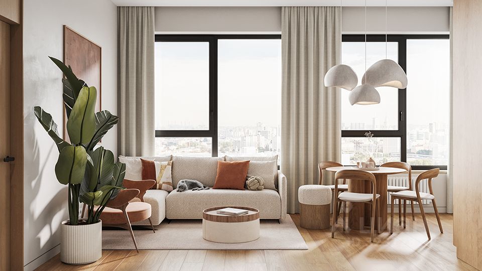 — Линейная кухня аккуратно встроена в общую зону и оставляет больше свободы для семейного сценария