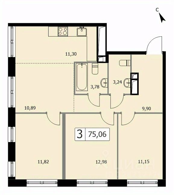 Просторная и светлая квартира площадью 74,8 кв. м. Продуманная планировка квартирывключает в себя отдельное расположение спальни от обеденно - гостиной зоны. Из оконгостиной открывается вид на Останкинскую башню, колесо обозрения и другие высотные