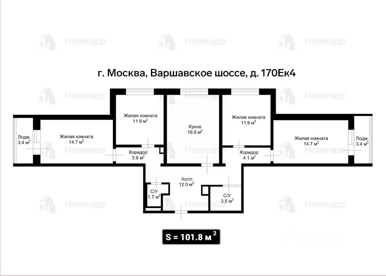 Функциональная планировка: все комнаты изолированные правильной формы, жилой площадью 53,2 м² (14,7; 11,9; 14,7; 11,9).