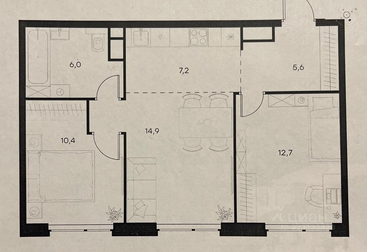 Кухня-гостинная 22.1 м2, две комнаты изолированные ( 10.4-12.7)