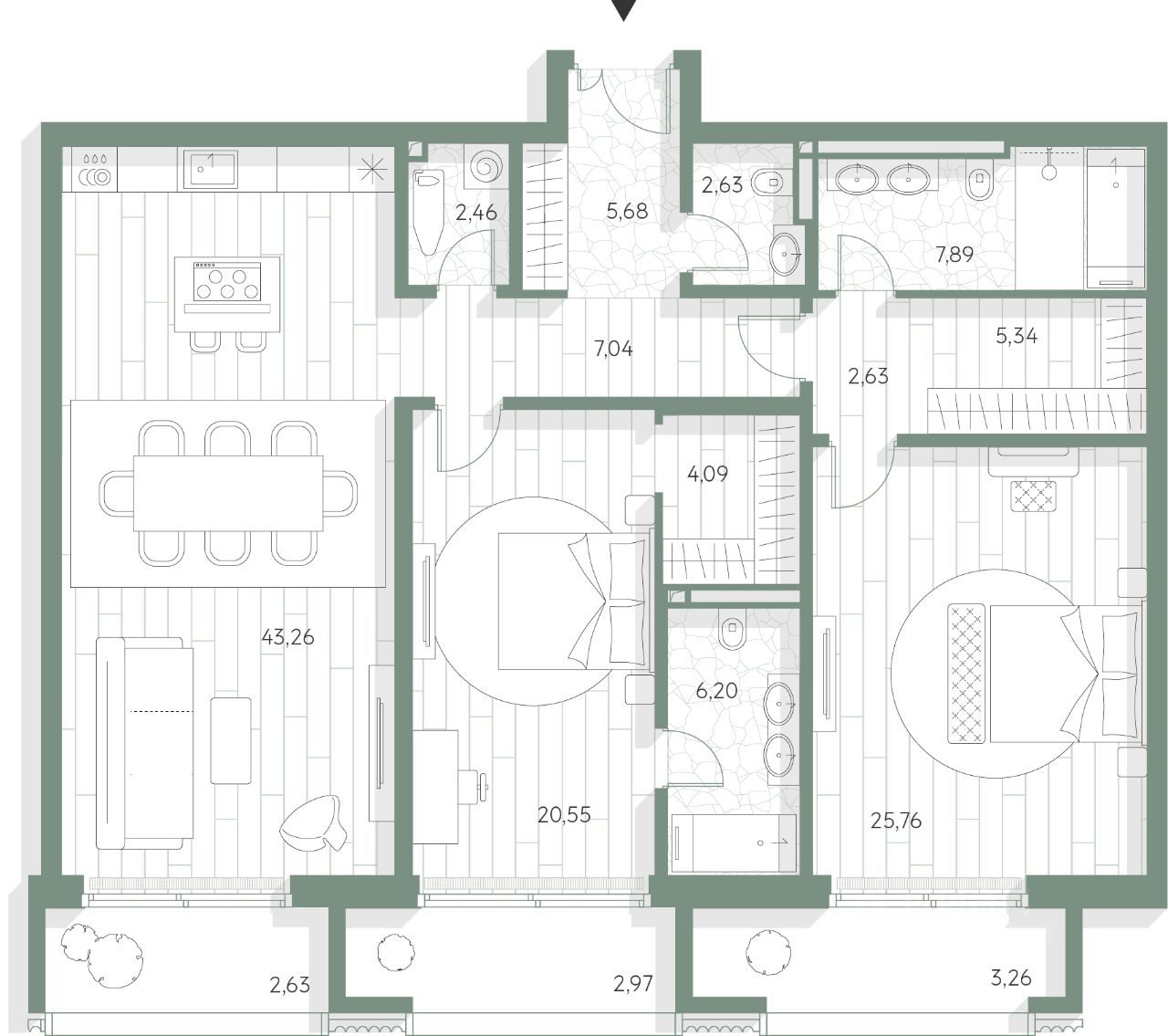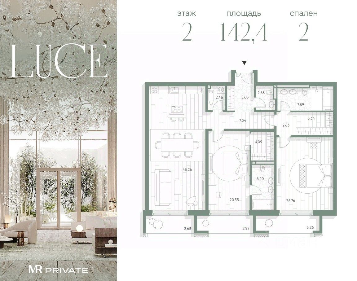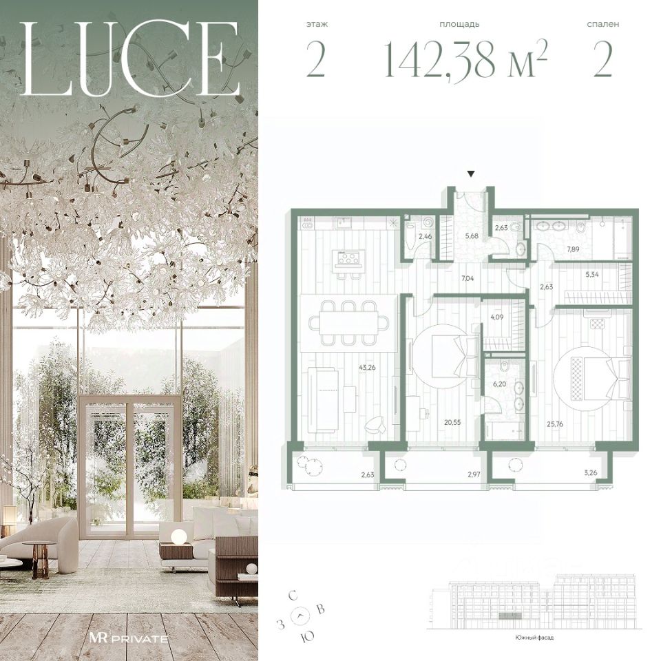 2-комнатная квартира общей площадью 142.38 м² в фамильном доме LUCE, расположенная на 2 этаже 7-этажного дома.