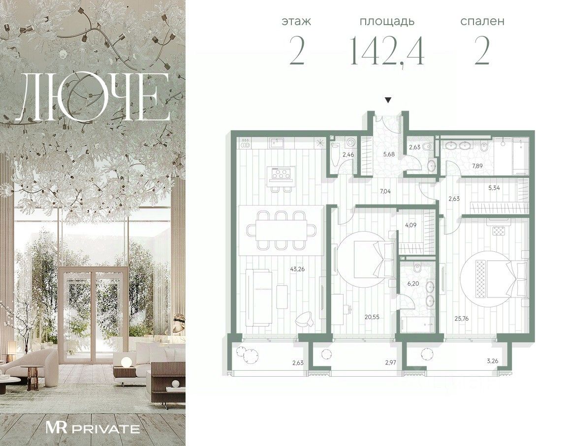 2-комнатная квартира общей площадью 142.38 м² в фамильном доме Люче, расположенная на 2 этаже 7-этажного дома.