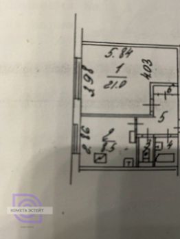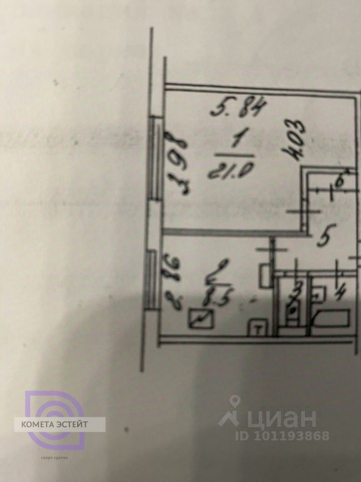 Общая площадь — 38,7 кв. м, жилая площадь — 21 кв. м, кухня — 8.5 кв. м.