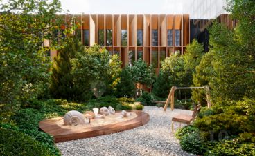 - Внутренняя территория двора разделена на 4 зоны, плавно перетекающие друг в друга и объединенные сетью уединенных маршрутов. Во дворе игровые площадки для детей разных возрастов, спортивная зона, зона отдыха, чайный домик, пруд с навесом и амфитеатр.