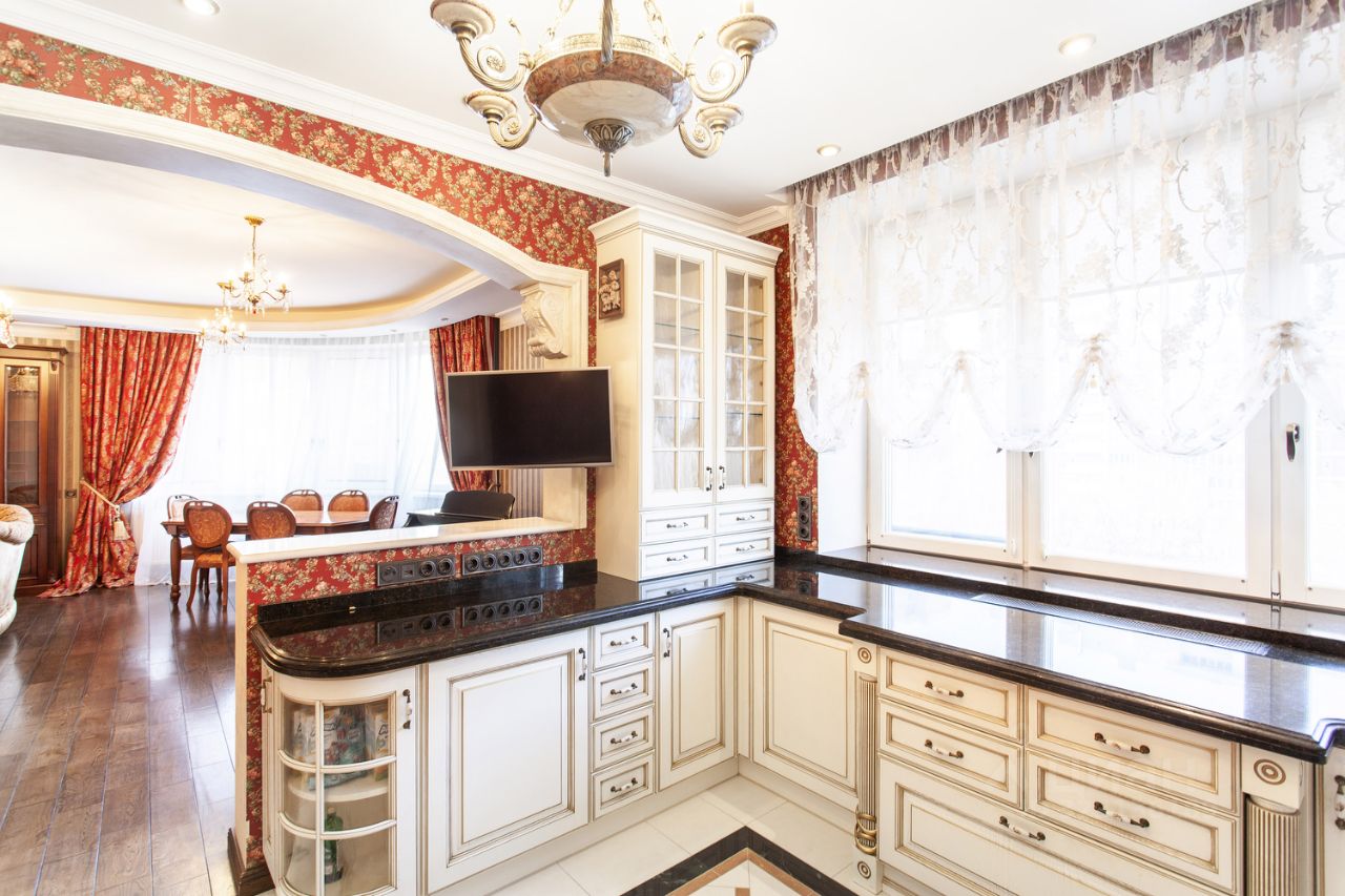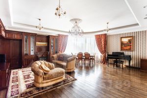 Кухонный гарнитур Verona (Италия) по индивид. проекту со столешницей из натурального камня с ирризацией. Варочная панель и духовой шкаф Miele, вытяжной модуль Kuppersbusch, п/моечная машина Bosch, винный температурный шкаф LIEBHERR Vinidor, два встроенных холодильника LIEBHERR. Диван в гостиной выполнен по индивид. заказу в стиле основной мебели. Портал между кухней и гостиной расписан под мрамор вручную. Во всех помещениях многоуровневое освещение. Люстры: Муранское стекло, керамика Италия. Встроенные светильники со стразами Swarovski.
