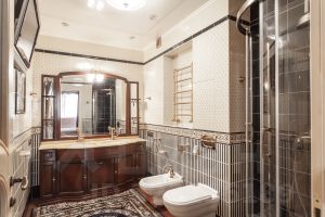 Пол: натуральный дуб, керамогранит мозайка, с шестью зонами подогрева (Германия).