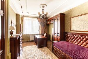 В кабинете мебель по индивид. проекту из натур. дерева и кожи.