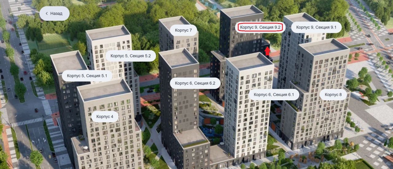 3 очередь строительства, 5 этап, корпус 9, секция 9.2, этаж 9. В секции всего 19 этажей, 8 квартир на этаже (см. фото плана этажа). Квартира без отделки. Окна в пол выходят на две стороны, северо-восток (на школу) и юго-восток (на одноэтажную часть знакового здания) расположение окон см. фото карты, желтые треугольники.