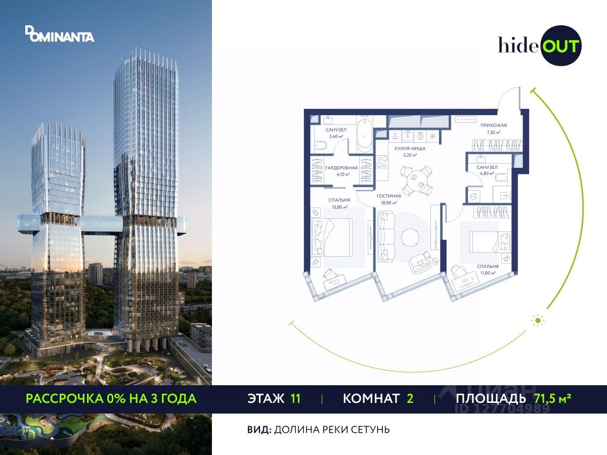 Продается 2-комнатная квартира площадью 71,5 кв.м. на 11-м этаже 34-этажного дома в ЖК hideOUT с панорамными видами: Долина реки Сетунь. Высота потолков 3,25 м.