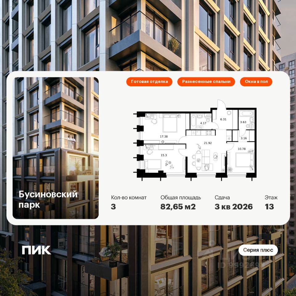 Продаётся 3-комн. квартира площадью 82,65 кв.м на 13 этаже 32 этажного дома (Корпус 1.4, Секция 2) проекта ПИК Бусиновский парк. Светлый просторный подъезд на уровне земли, функциональная планировка, большие окна, c отделкой.