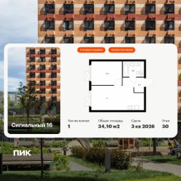 Продаётся 1-комн. квартира площадью 34,1 кв.м на 30 этаже 33 этажного дома (Корпус 2.1.1, Секция 1) проекта ПИК Сигнальный 16. Светлый просторный подъезд на уровне земли, функциональная планировка, большие окна, c отделкой.