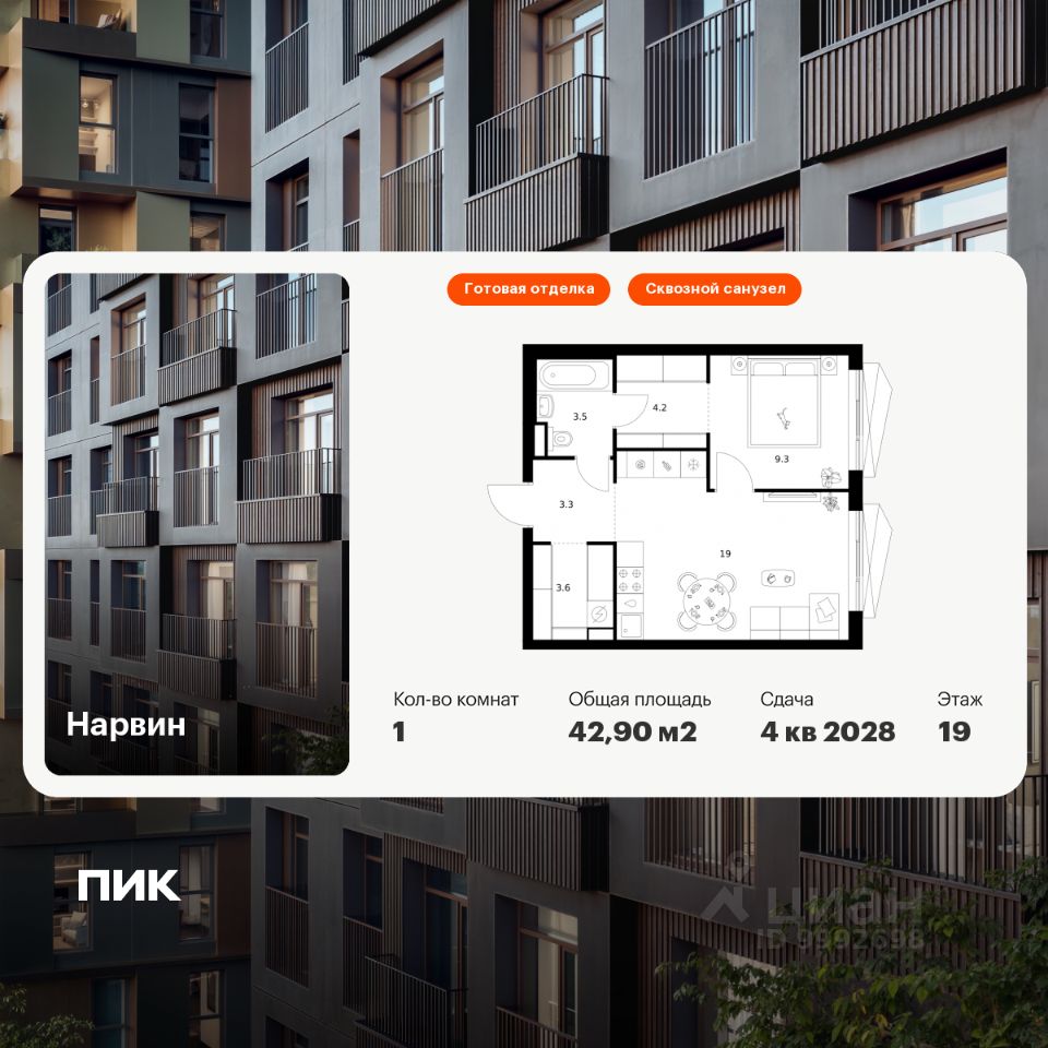 Новостройка! Продается 1-комн. кв-ра площадью 42,9 кв.м, (Корпус 1.3, Секция 3) 19 этаж 38-этажного дома в Нарвин от ПИК. Новый проект ПИК Серии плюс "Нарвин" возводится в Головинском районе Москвы.