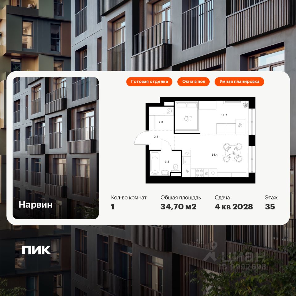 Новостройка! Продается 1-комн. кв-ра площадью 34,7 кв.м, (Корпус 1.3, Секция 3) 35 этаж 38-этажного дома в Нарвин от ПИК. Новый проект ПИК Серии плюс "Нарвин" возводится в Головинском районе Москвы.