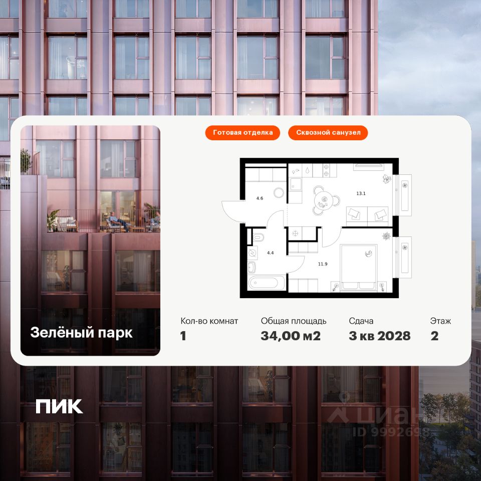 Продаётся 1-комн. квартира площадью 34 кв.м на 2 этаже 13 этажного дома (Корпус 5.3, Секция 3) проекта ПИК Зелёный парк. Светлый просторный подъезд на уровне земли, функциональная планировка, большие окна, c отделкой.