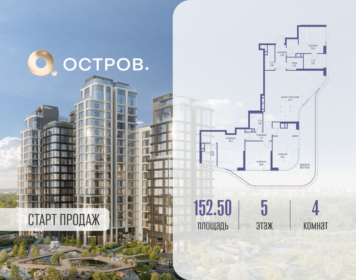 Продаётся 4-комн. квартира от застройщика: общая площадь 152.50 м², жилая 66.90 м², кухня 41.10 м², 5-й этаж, жилой квартал "Остров 12", корпус 3 (секция 1). Срок сдачи: 1 квартал 2029 года.