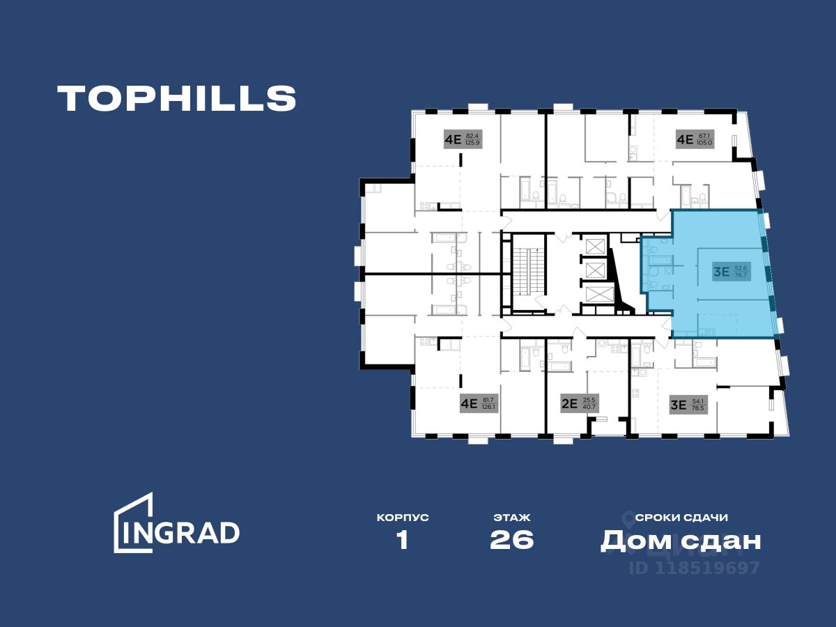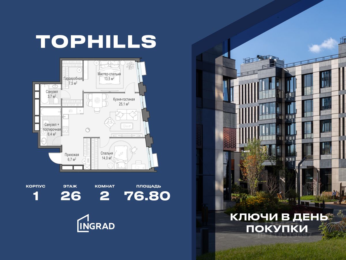 Прямая продажа от застройщика. В жилом квартале, расположенном в Нагорном районе Москвы, продаётся 2-спальная квартира площадью 76.80 кв.м без отделки. Квартира расположена на 26 этаже 26-этажного дома, корпус 1, в жилом квартале бизнес-класса TopHILLS (застройщик ГК Инград).