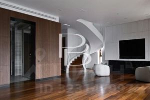В отделке использованы ценные пароды дерева и натуральный камень. Интерьер выдержан в современном стиле, квартира украшена мебелью и техникой от известных мировых производителей.