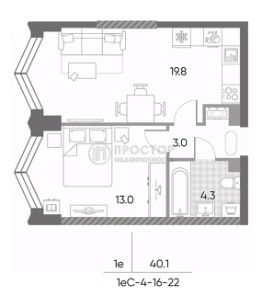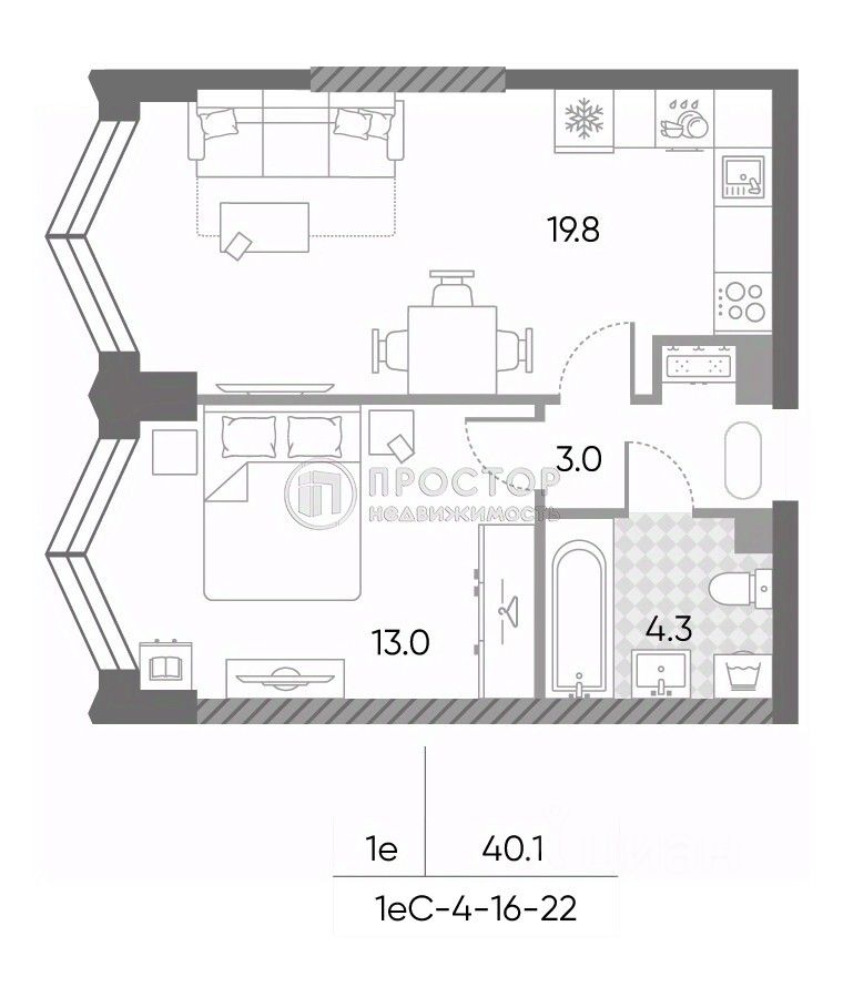 Квартира расположена на 19 этаже 23-этажного монолитного дома, построенного в 2025 году. Общая площадь — 40,1 кв. м, из которых 13 кв. м занимает жилая площадь, а 19.8 кв. м — просторная кухня. Высота потолков составляет 3 метра, что создаёт ощущение простора и свободы.