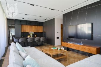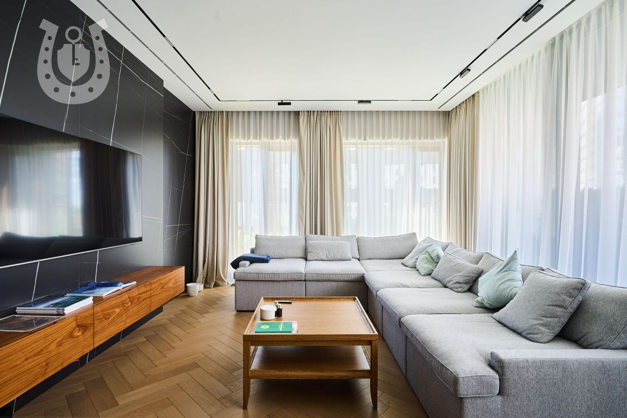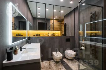 Санузлы: стены и полы из камня Archskin 3000 1200 5,5 мм, душевые Hansgrohe Rain. Климат-контроль на 5 зон (гостиная + 3 спальни), электрошторы на всех окнах, беспроводные датчики протечки с авто-запором воды, стабилизатор электросети.
