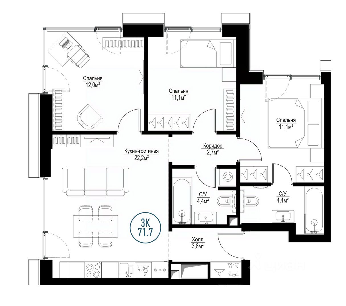 Продаётся 3-комнатная квартира общей площадью 70.70 м², на 3 этаже.