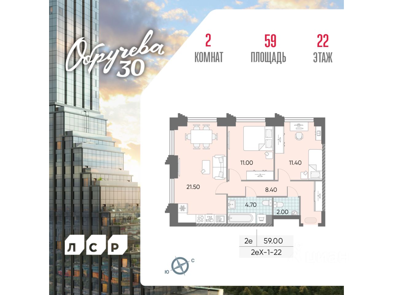 Продается 2-комнатная квартира общей площадью 59 кв. метров на 22 этаже дома бизнес-класса "Обручева 30". Дом располагается в 5 минутах ходьбы до станции метро "Калужская" и 10 минутах до станции метро "Воронцовская". Для автомобилистов удобный и быстрый выезд на улицы Обручева и Профсоюзную.