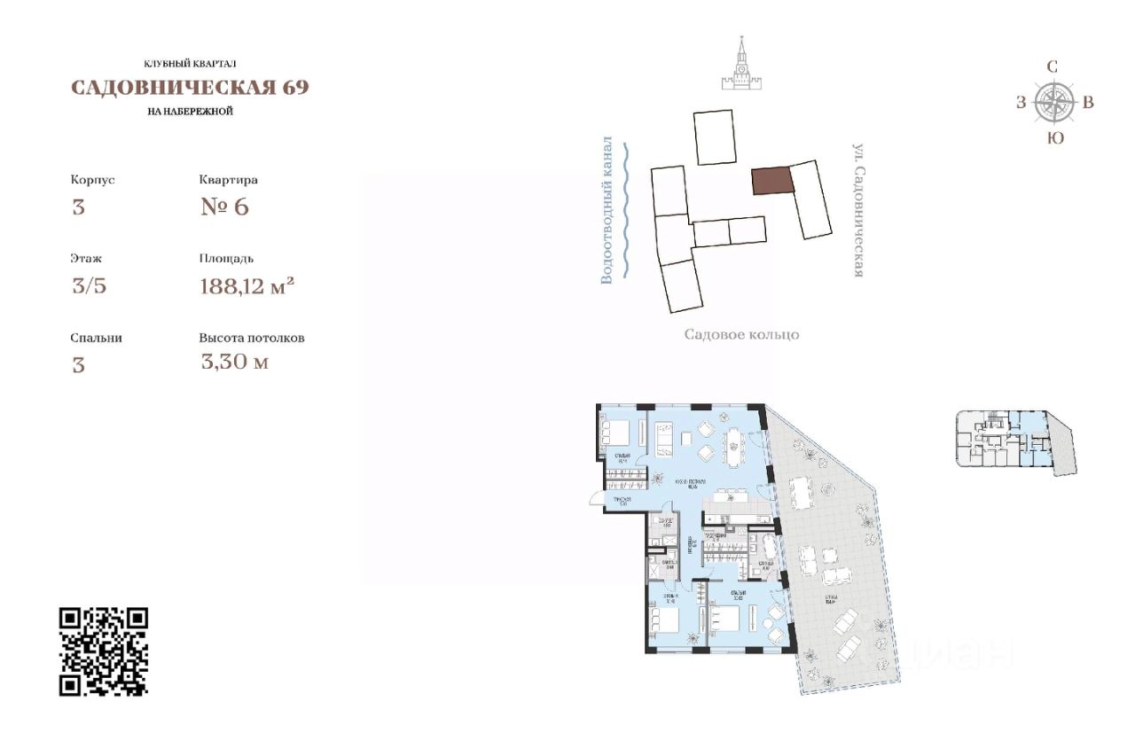 Просторная светлая квартира площадью 188,12 кв.м. Из окон квартиры открываются живописные виды на Москва-реку, старинные мосты и величественные башни Кремля. Витражное остекление выходит на тихую гладь реки или внутренний сад — такое решение обеспечивает максимум естественного света и красивые панорамы.