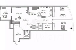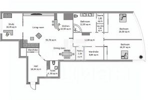 Гостиная зона совмещена с роскошной столовой, две светлые спальни, лаконичный кабинет, ванная комната (джакузи, душевая кабина, сауна), гостевой санузел, гардеробная, постирочная.
