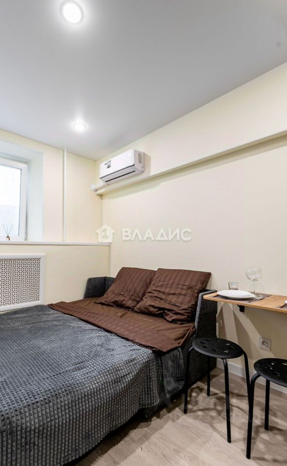 Благодаря большому окну, в студии очень светло, это высокий цокольный этаж.