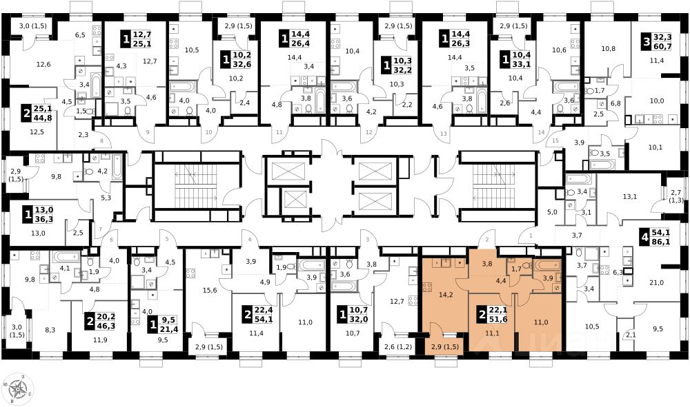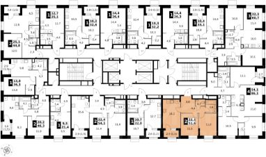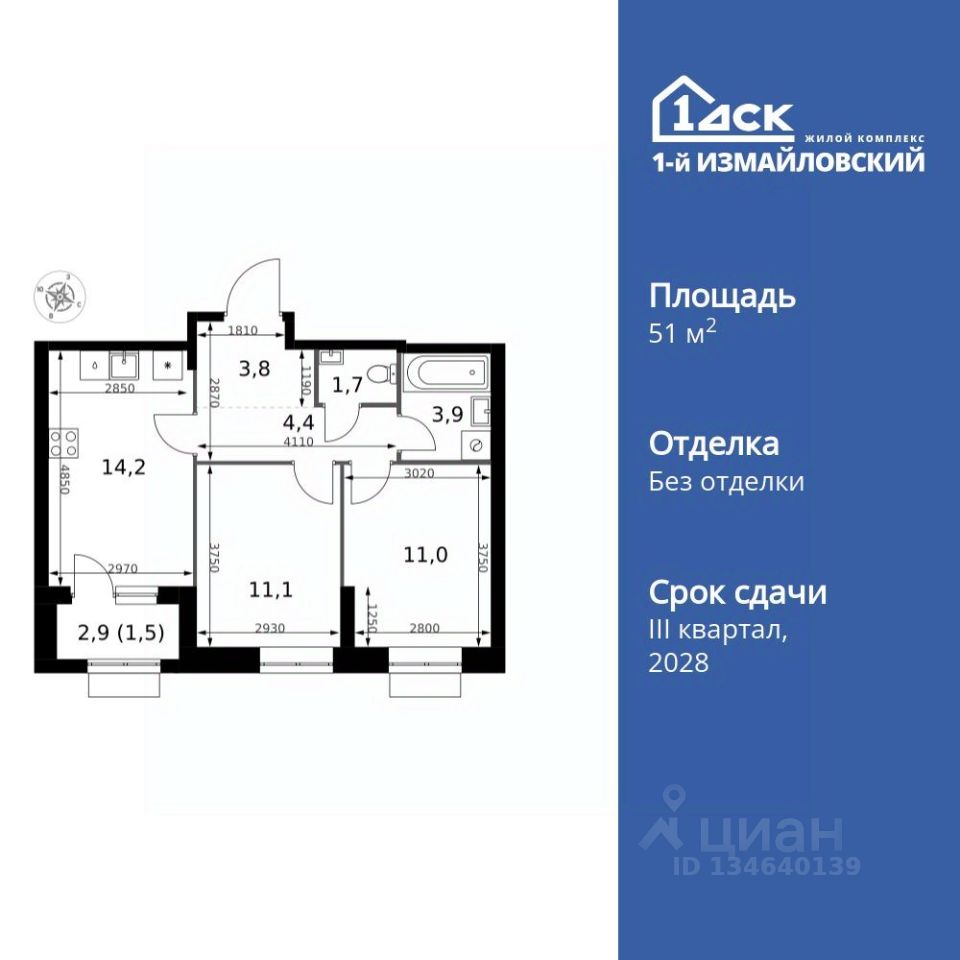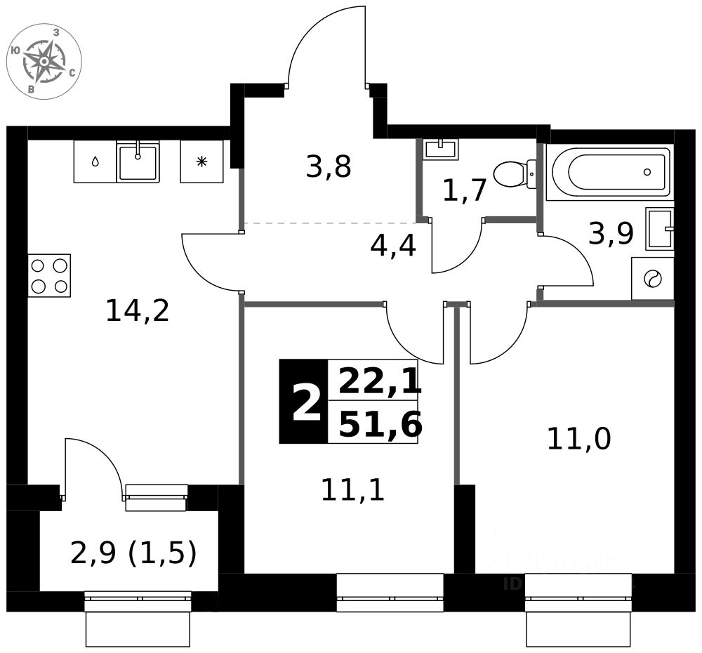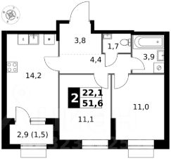 Продаётся 2-к квартира номер 466 общей площадью 51.6 кв.м. на 5-м этаже 32 этажного здания. Без отделки.