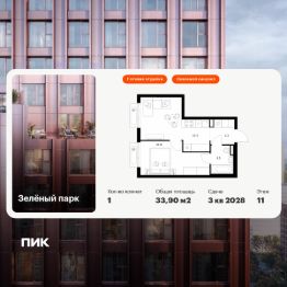 Продаётся 1-комн. квартира площадью 33,9 кв.м на 11 этаже 21 этажного дома (Корпус 5.2, Секция 1) проекта ПИК Зелёный парк. Светлый просторный подъезд на уровне земли, функциональная планировка, большие окна, c отделкой.