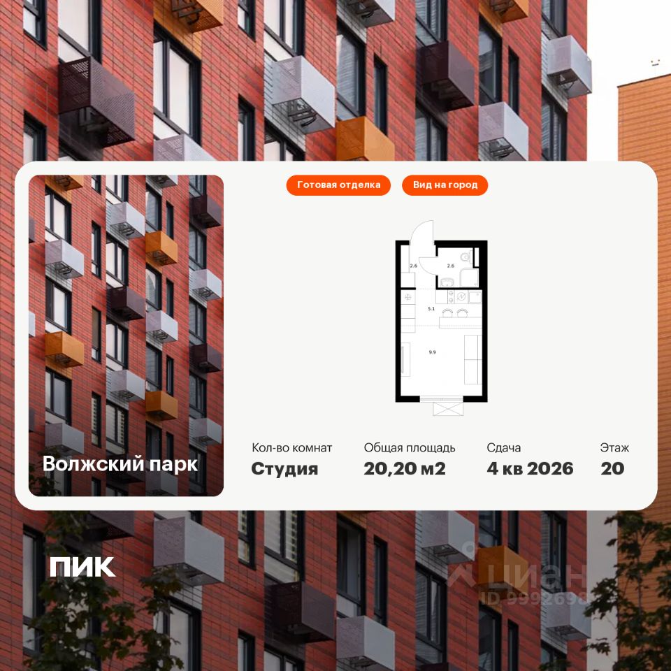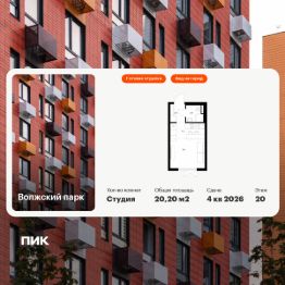 Продаётся квартира-студия площадью 20,2 кв.м на 20 этаже 24 этажного дома (Корпус 6.2, Секция 1) проекта ПИК Волжский парк. Светлый просторный подъезд на уровне земли, функциональная планировка, большие окна, c отделкой.