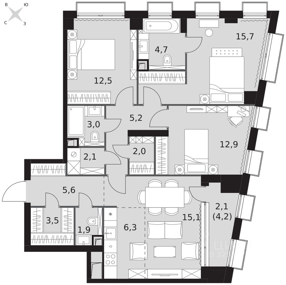 Продаётся 4-к квартира номер 349 общей площадью 92.6 кв.м. на 7-м этаже 43 этажного дома. Отделка Whitebox. Цена с учётом скидки!