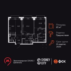 Продаётся 2-к квартира номер 507 общей площадью 65.3 кв.м. на 23-м этаже 43 этажного здания. Отделка Whitebox. Цена с учётом скидки.
